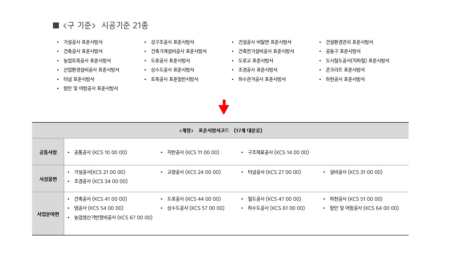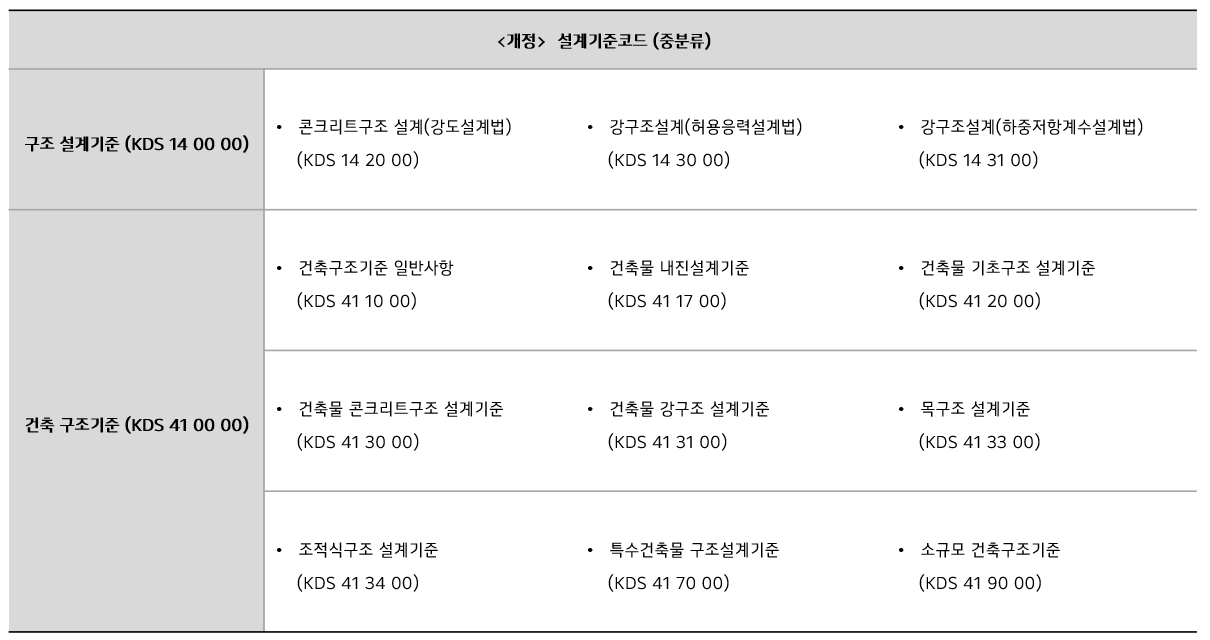 대표적으로 설계기준코드(KDS), 표준시방서(KCS) 두 분류로 코드 체계가 개편되었습니다.